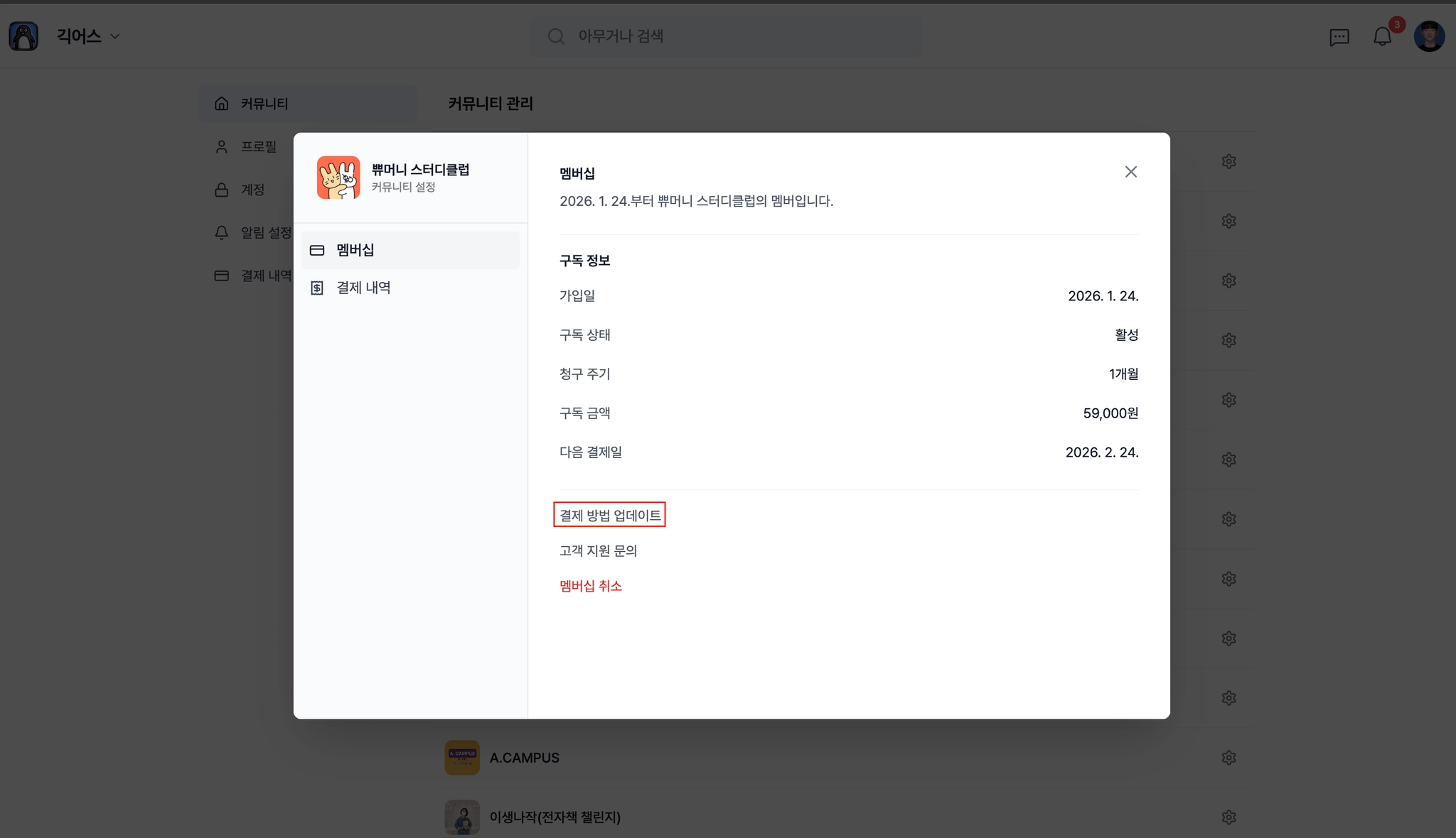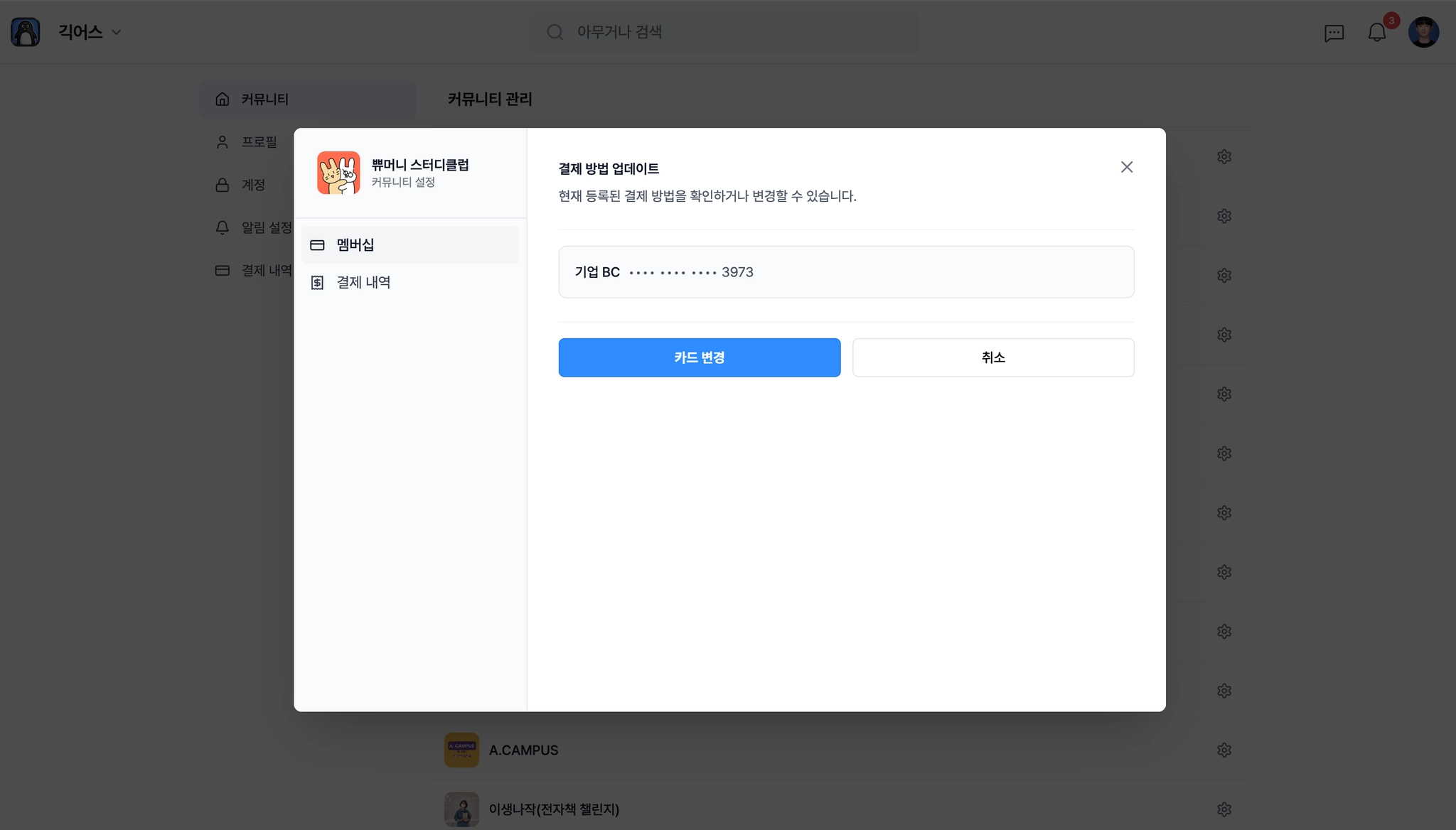 결제 수단 변경하고자 하는 커뮤니티 이름의 우측 톱니 바퀴