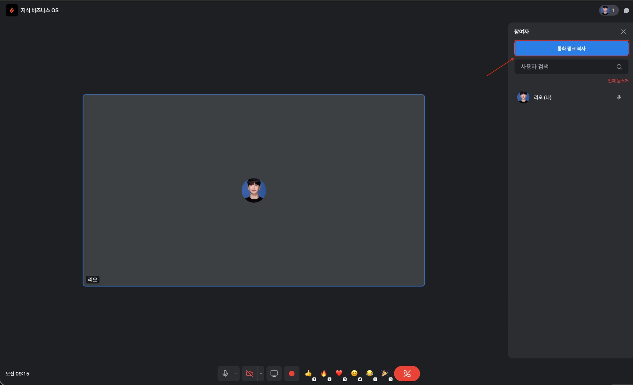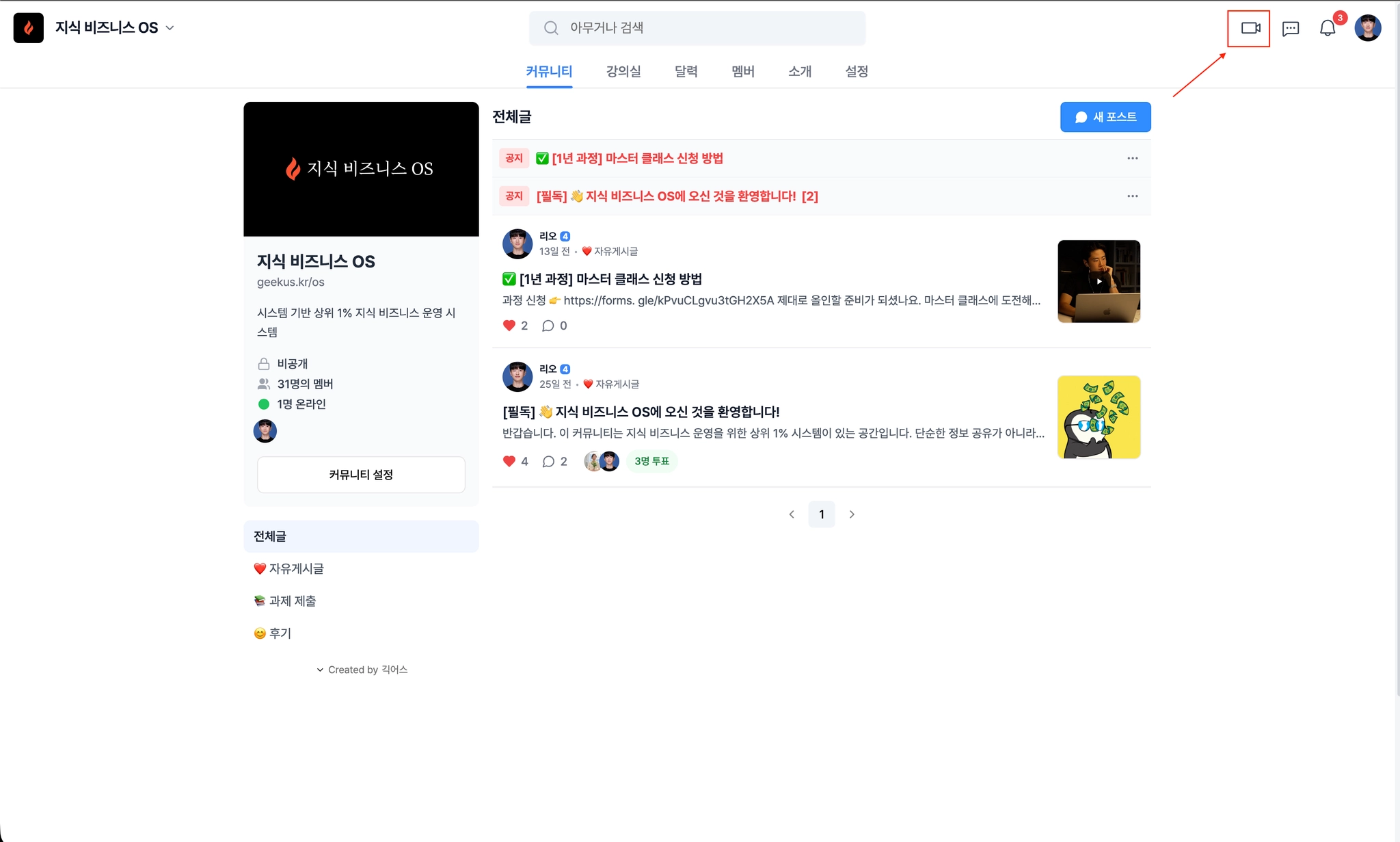 상단의 비디오 버튼 클릭 (커뮤니티 관리자와 오너만 화상 미팅 개설 가능.)